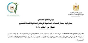 في إطار التنسيق المستمر بين المجلس التصديري للصناعات الغذائية والهيئة القومية لسلامة الغذاء , ورد إلى المجلس بشأن آلية الجديدة لإصدار شهادات الصلاحية للرسائل الغذائية